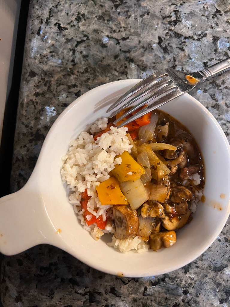 I got the Passage To Asia Thai Basil and Chili ready made sauce. 2 packs. Then I sautéed onions 🧅 bell peppers 🫑 and mushrooms 🍄 after that I added in the sauce.